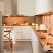 Es muy importante que la zona en la que manipules los alimentos disponga de una buena iluminación dirigida. Lo mejor es situar luces bajo los gabinetes altos que son específicas para este tipo de instalación (tiras LED que enfoquen directamente hacia la encimera y focos spots).